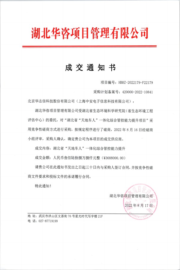 中安科技中標(biāo)湖北生態(tài)環(huán)科學(xué)院“湖北省‘天地車(chē)人’一體化綜合管控提升”項(xiàng)目(2022/10/10)